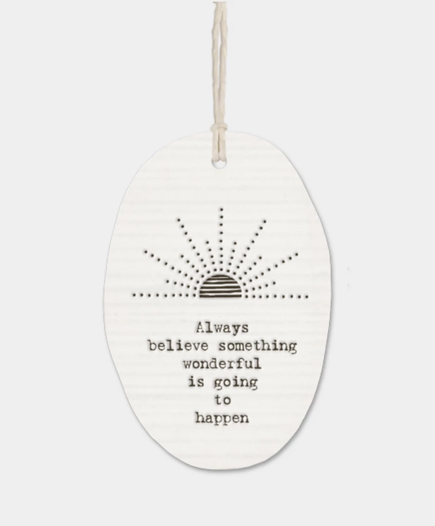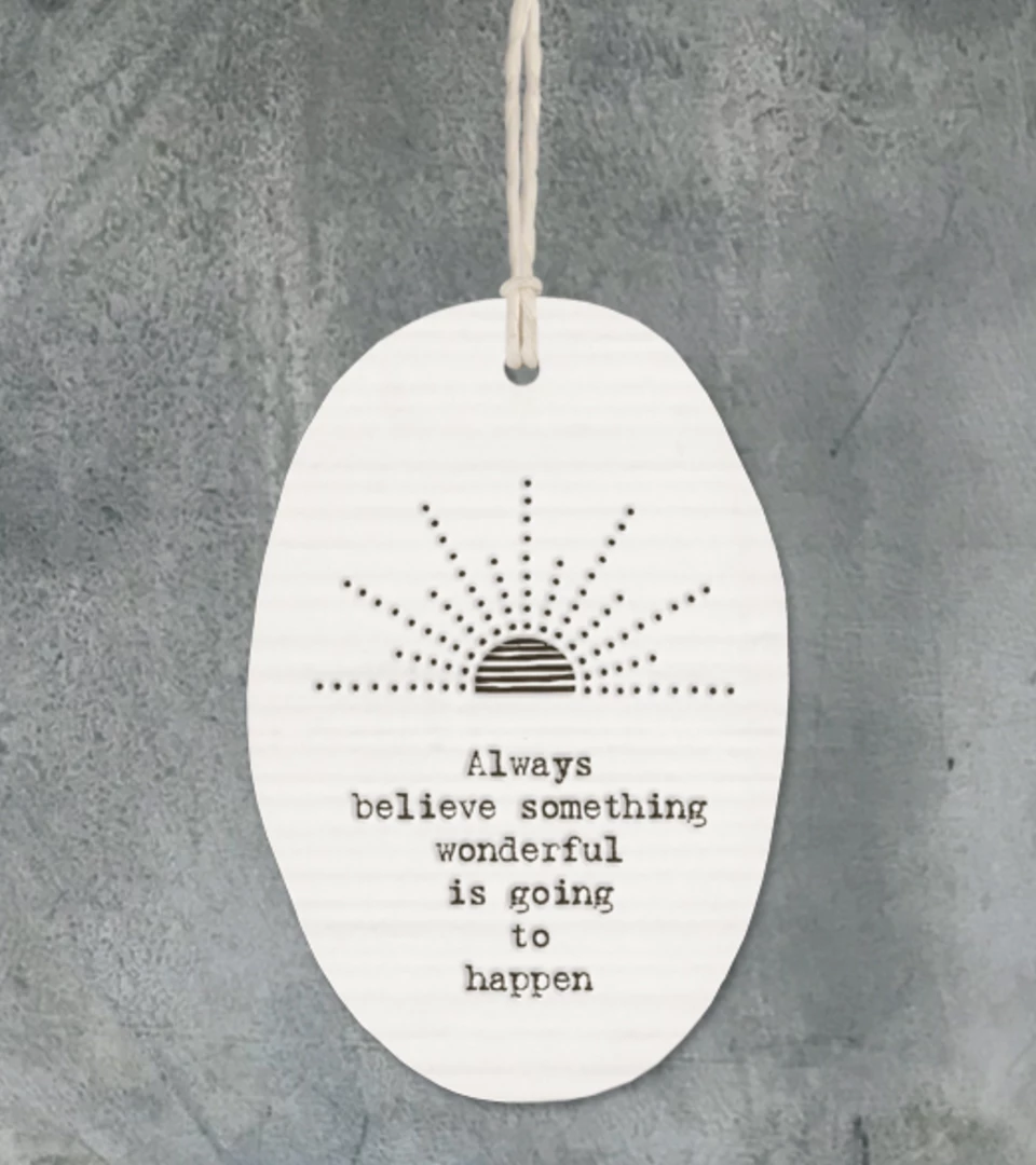 Β This lovely little oval porcelain hanger from East of India has a slightly rippled surface with an embossed message “Always remember something wonderful is going to happen”.Β Constantly one of our best sellers, theseΒ hangers make a perfect gift.Β