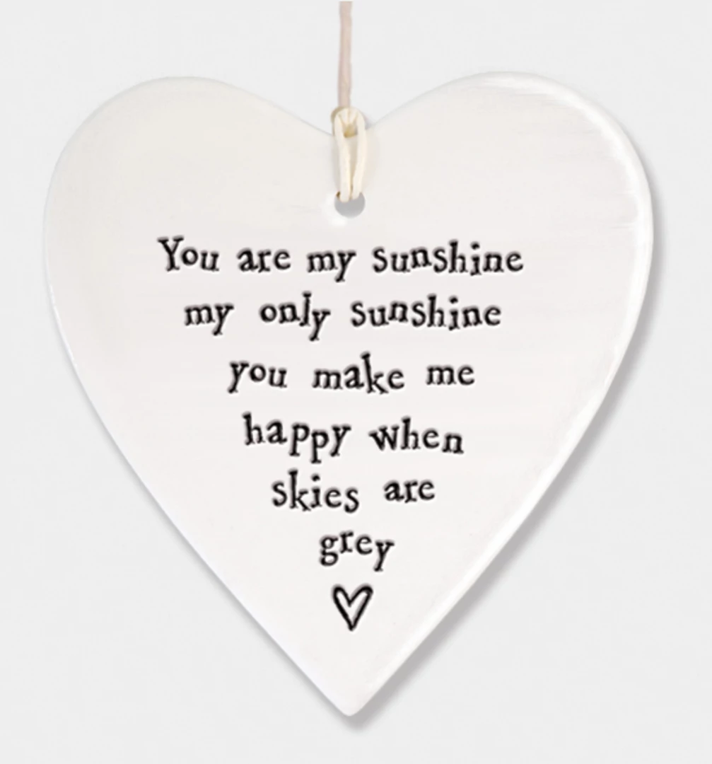 This lovely porcelain heart from East of India has a slightly rippled surface with an embossed message and a white string to hang it up with. Constantly one of our best sellers, these hearts make a perfect gift.