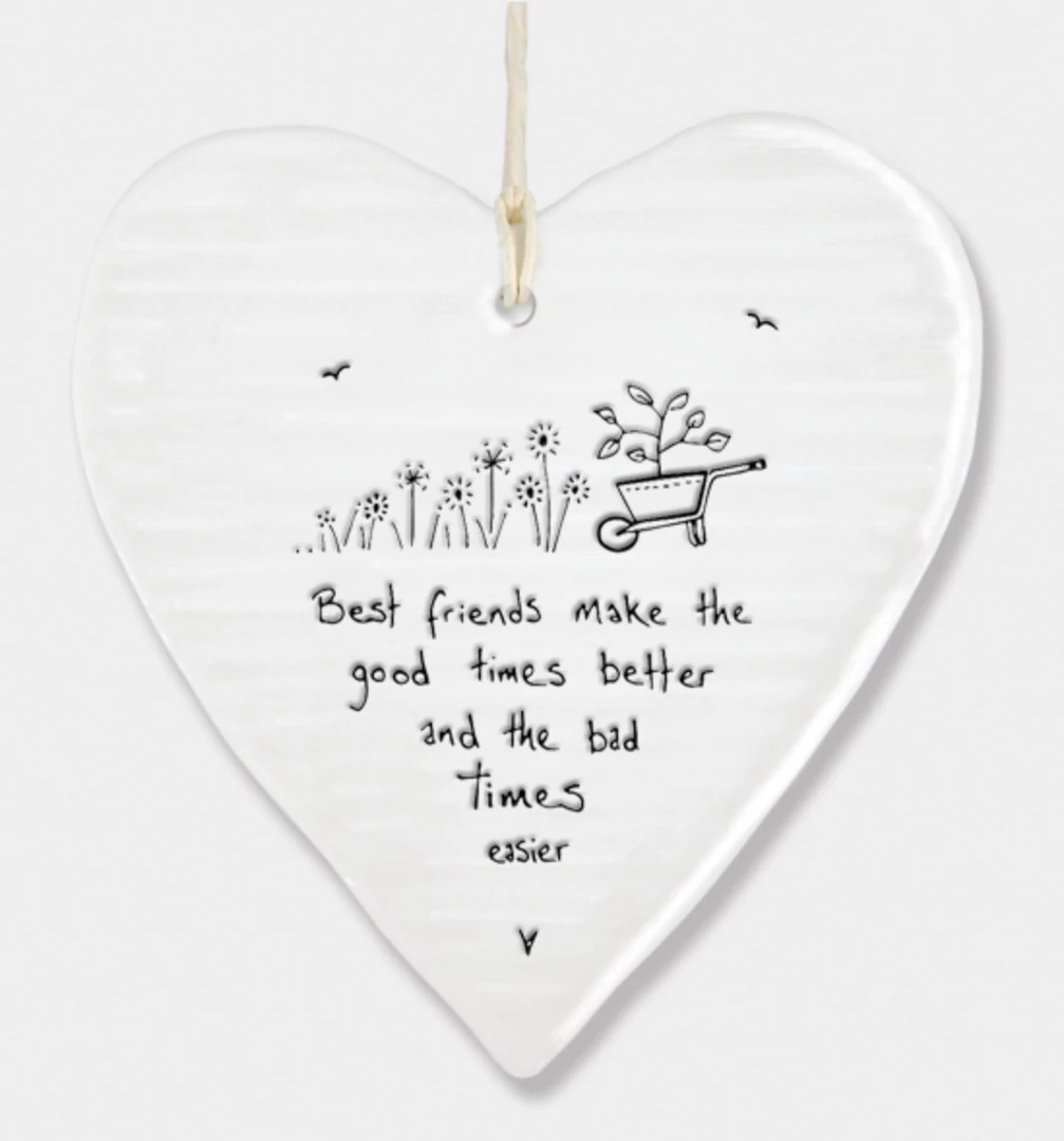 This lovely porcelainΒ heart from East of India has a slightly rippled surface with an embossed message and a white string to hang it up with. Constantly one of our best sellers, theseΒ hearts make a perfect gift.