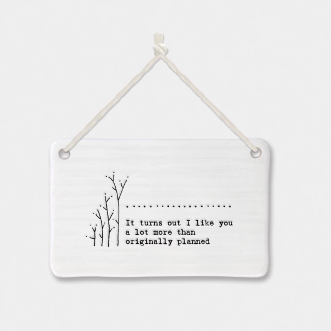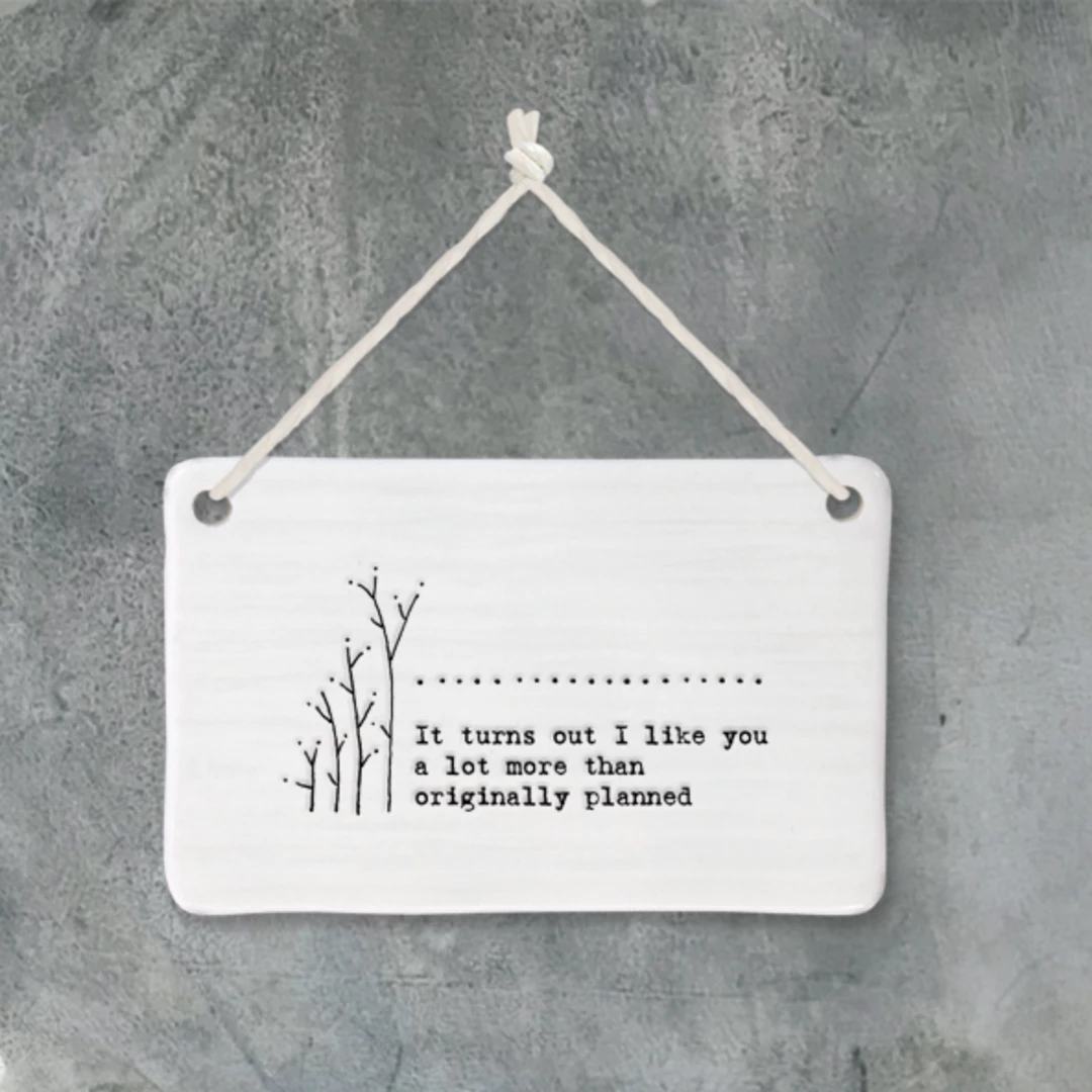 This lovely porcelainΒ hanging signΒ from East of India has a slightly rippled surface with an embossed message and a white string to hang it up with. Constantly one of our best sellers, theseΒ signs make a perfect gift.