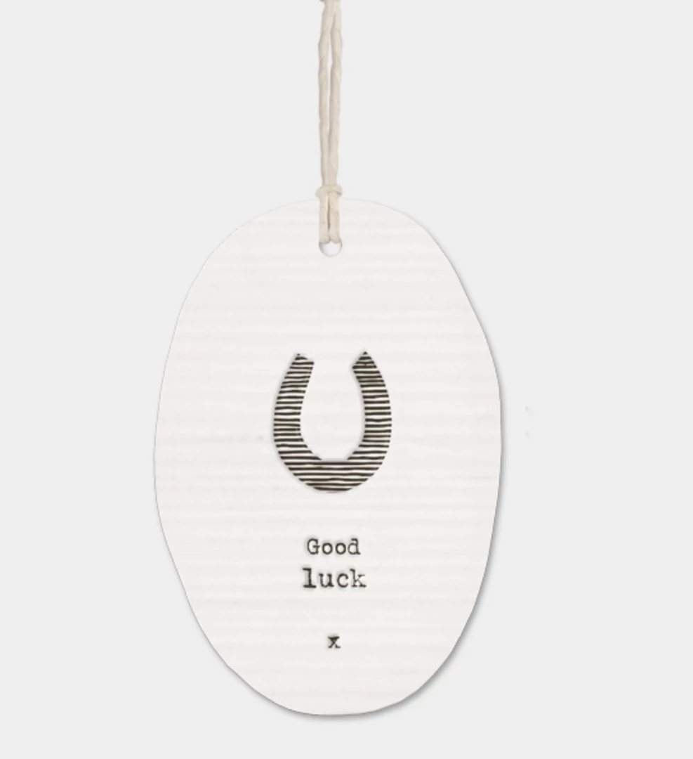 This lovely little oval porcelain hanger from East of India has a slightly rippled surface with an embossed message “Good Luck”.Β Constantly one of our best sellers, theseΒ hangers make a perfect gift.Β