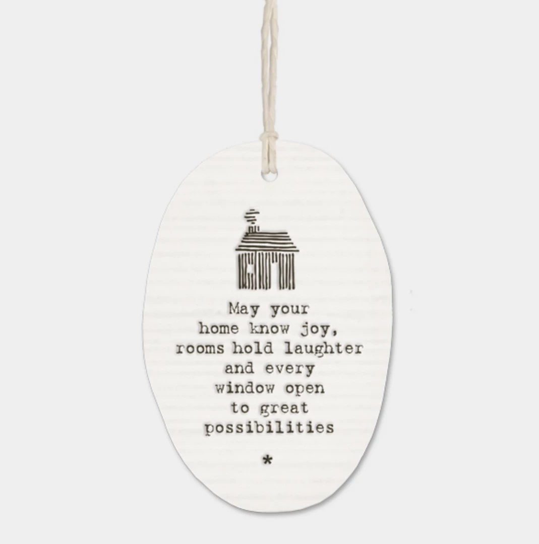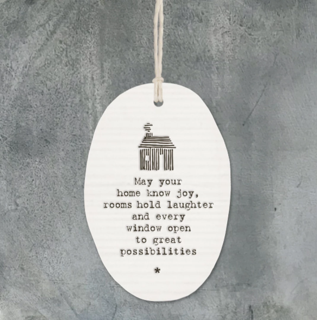 Β This lovely little oval porcelain hanger from East of India has a slightly rippled surface with an embossed message.Β Constantly one of our best sellers, theseΒ hangers make a perfect gift.Β