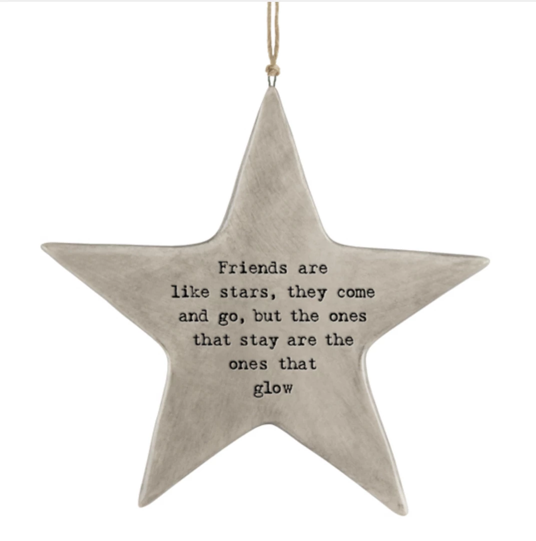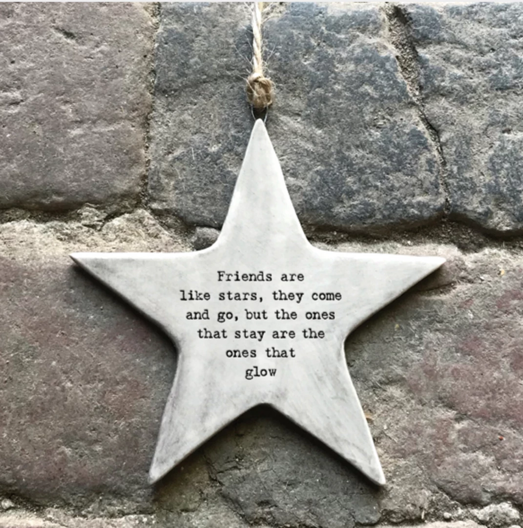 New ! A rustic finish porcelainΒ hangingΒ star sign from East of India has a slightly rippled surface with an embossed message and aΒ juteΒ string to hang it up with. Constantly one of our best sellers, theseΒ signs make a perfect gift.