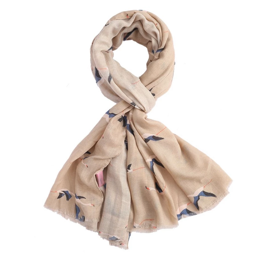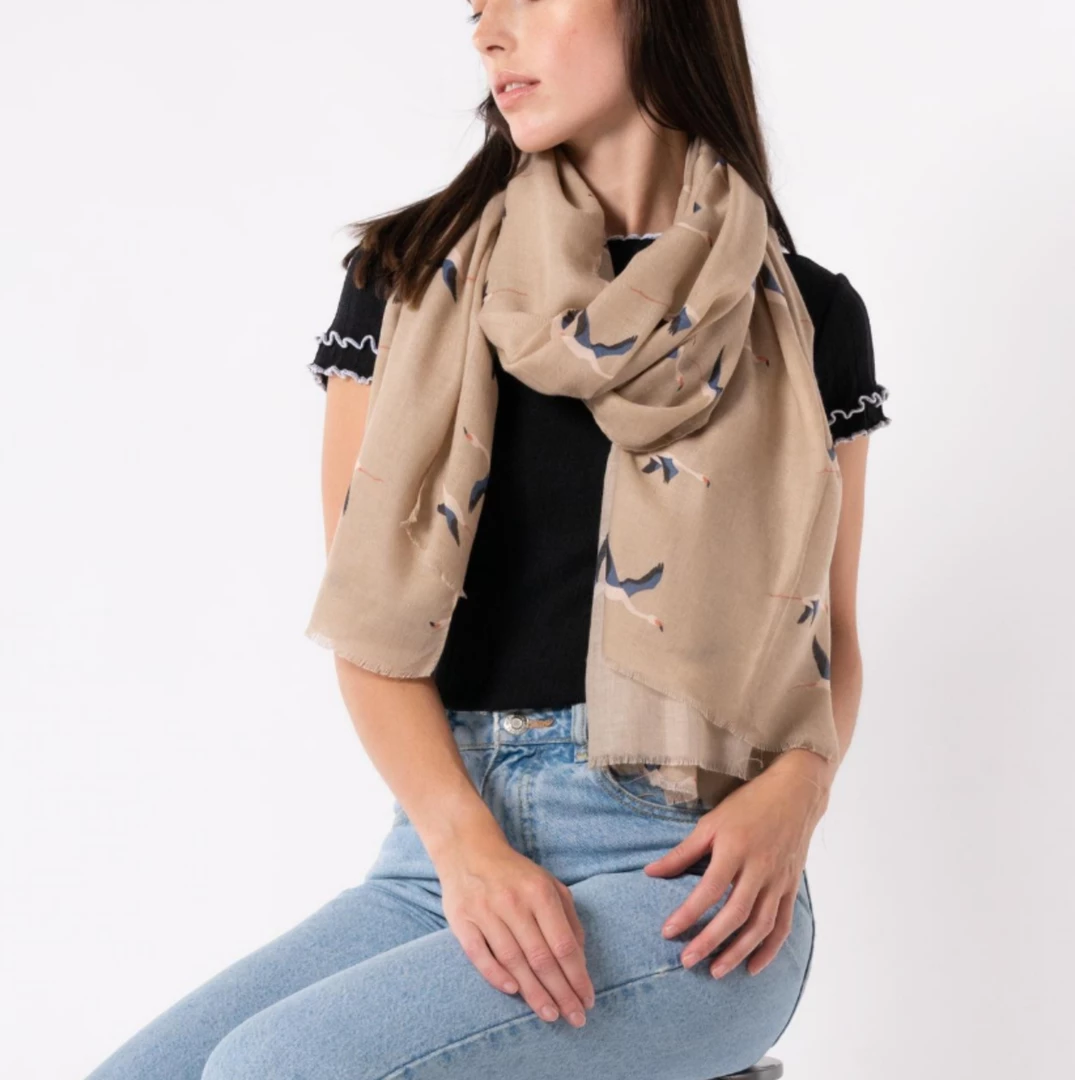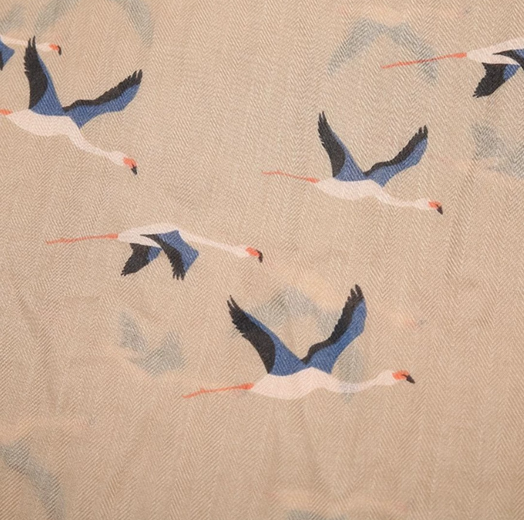 Flying flamingos print scarf on aΒ beige background made from a soft and light fabric