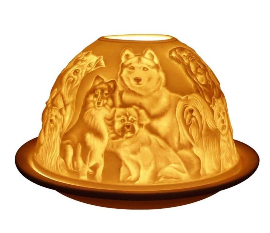 Lithophane is an etched or the moulded artwork in thin very translucent porcelain that can only be seen fully when backlit, in this case a candle or LED light.