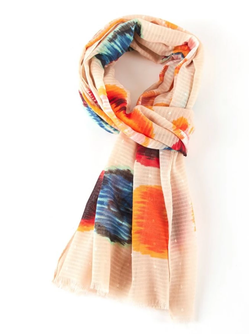 Ikat scarf inΒ beige tones with orange, blue and green abstract dotsΒ