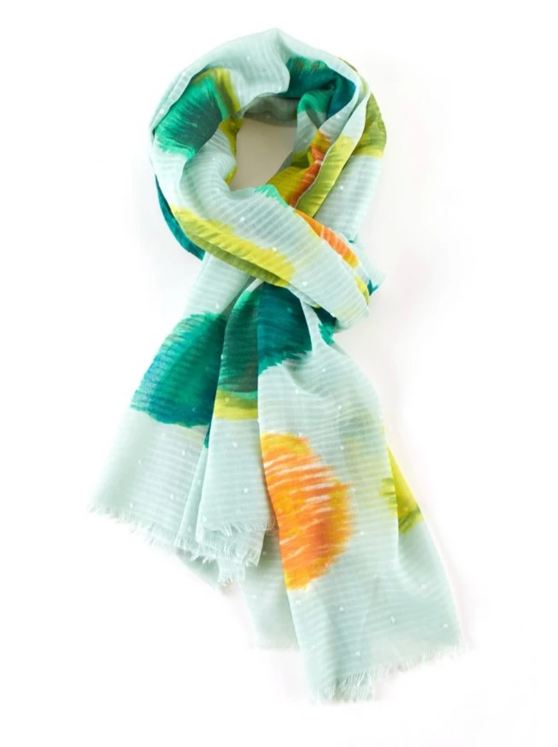 Ikat scarf in green with tones of orange, lime and green abstract dots