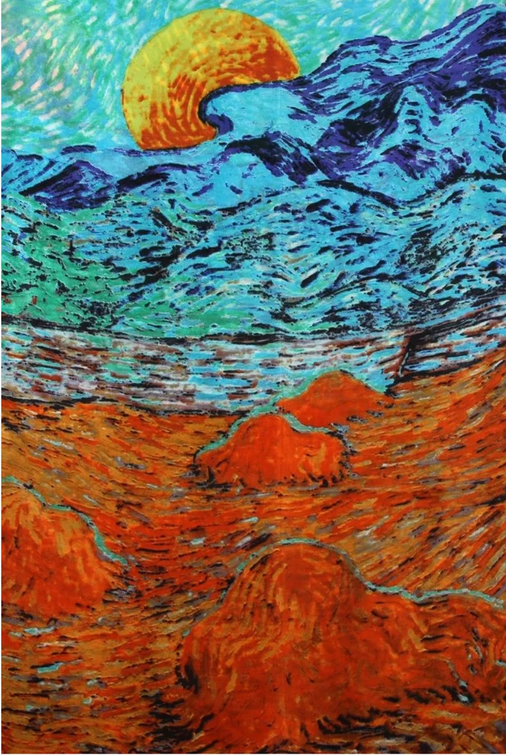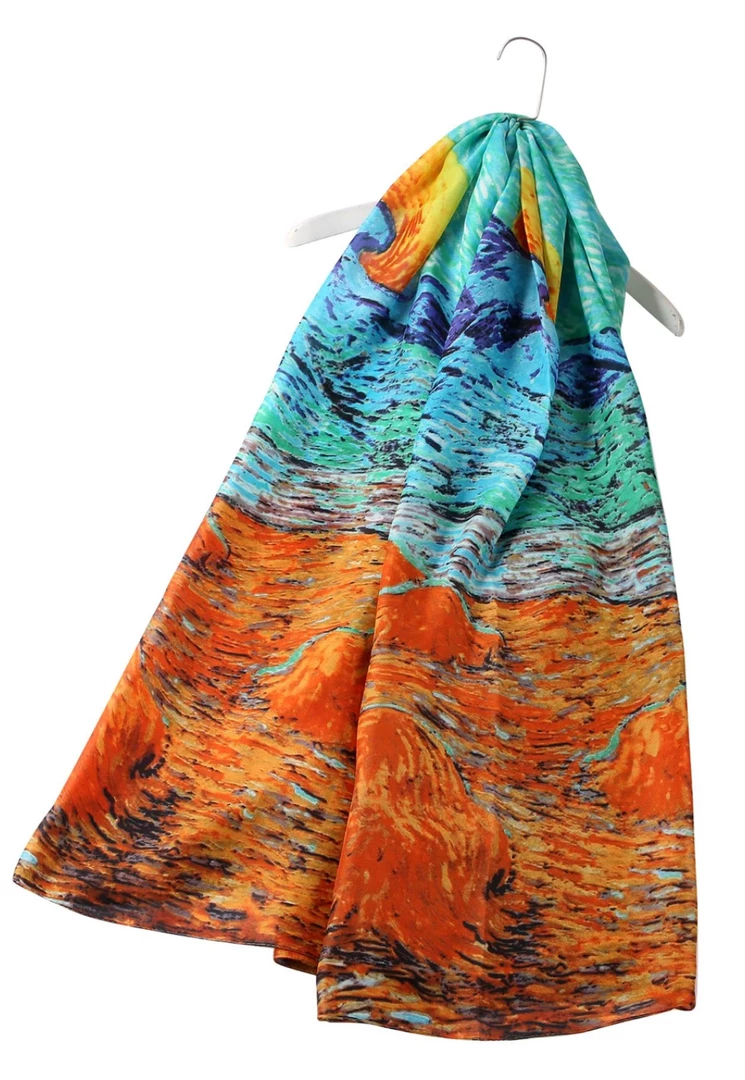 Β Treat yourself to a touch of genuine luxury with this beautiful pure silk scarf, featuring a design inspired by an Impressionist Sunset Oil Painting.