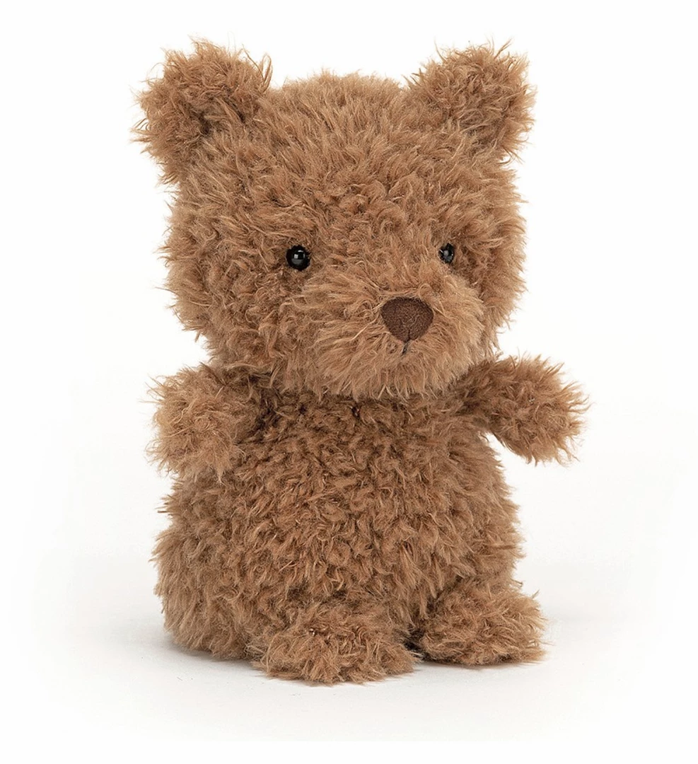 Little Bear is such a snoozy sweetpea. Fuzzly-soft in vintage toffee tussles, with wee bobble paws and a choolate-drop nose, this shy little snuggler wants to meet a loving friend. A classic pocket pal.