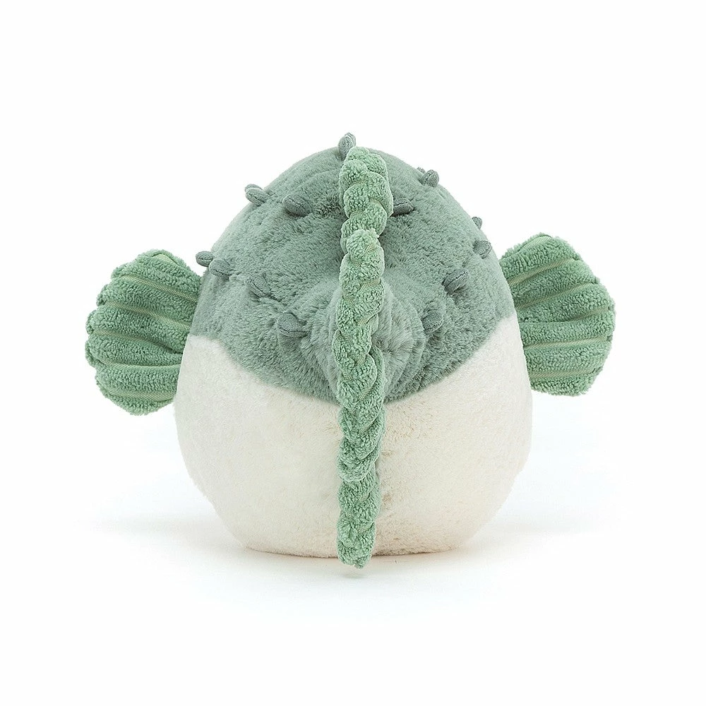 Eep โ looks like Pacey Pufferfish has had a big surprise! This dizzy dumpling is perfectly podgy, with a marshmallow tummy and seagrass fur. With stitchy fins, nuzzly knobbles, squidgy lips and boggly eyes, this funny fish is a bubble of cuddles! Chill out Pacey โ go with the flow!