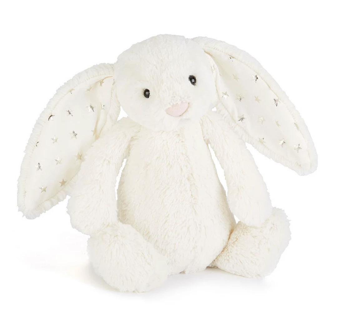 Bashful Twinkle Bunny shimmers and shines with gossamer soft creamy fur and glimmering silver stars in her ears. Indulge in the softest of cuddles with a Bashful Bunny as beautiful as stardust and as whimsically pretty as moonbeams in the night sky.