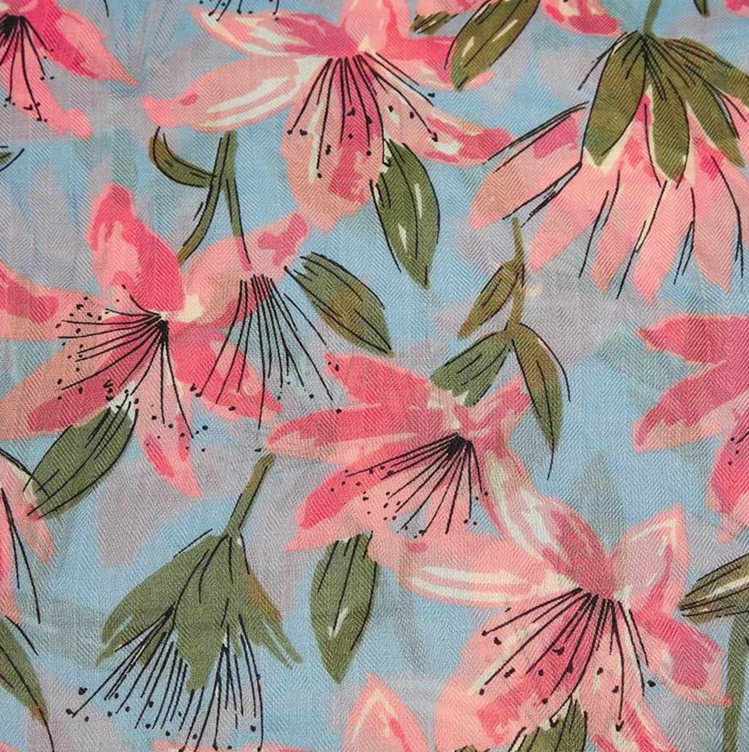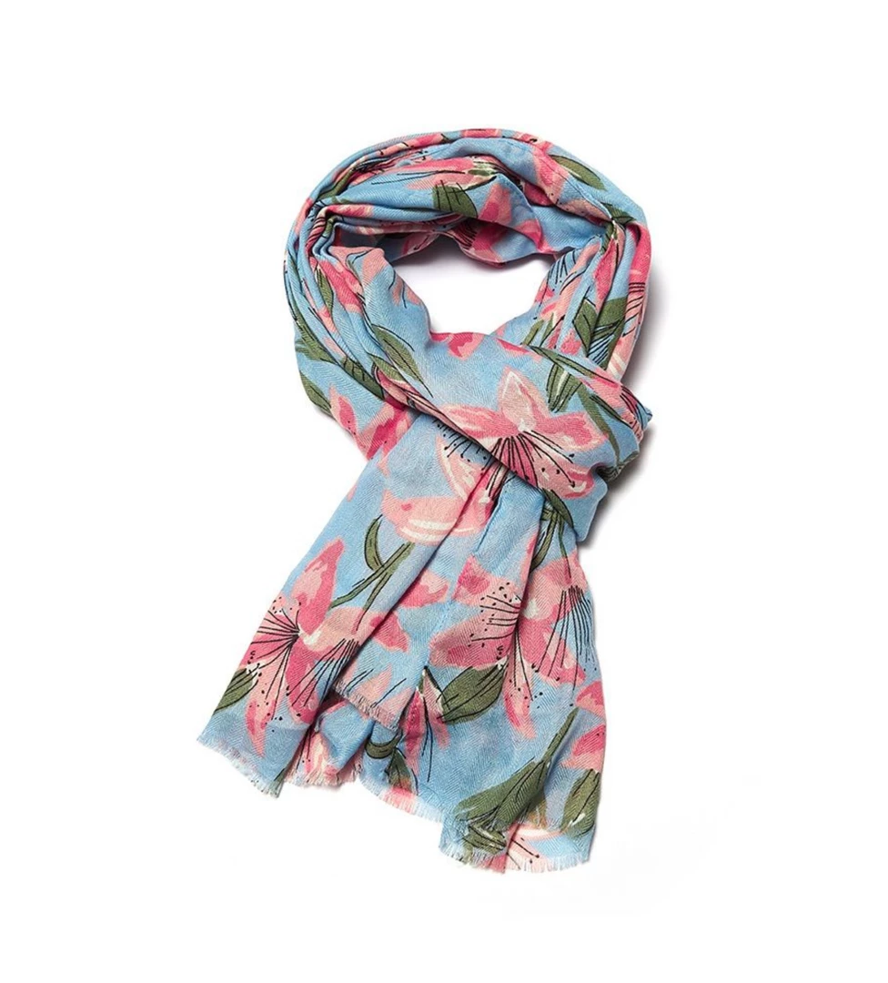 Lily print scarf on a powder blue background made from a soft and light fabric