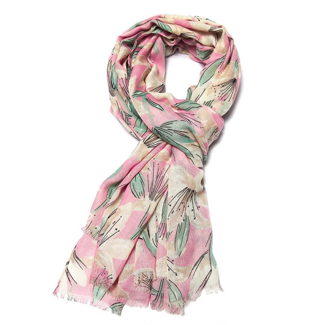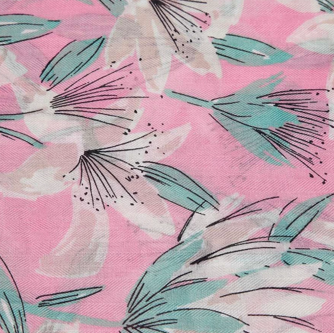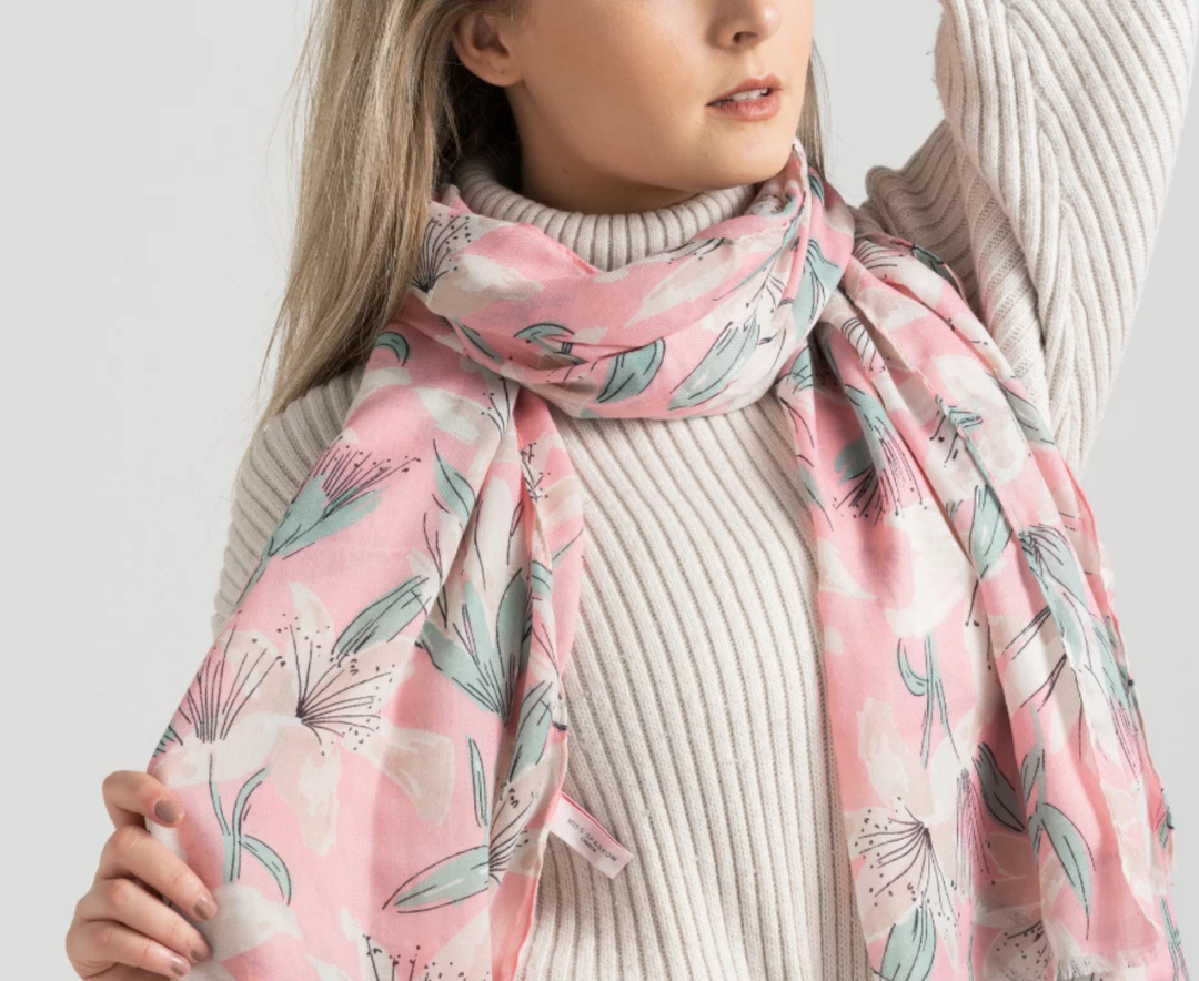 Lily print scarf on a powder blue background made from a soft and light fabric