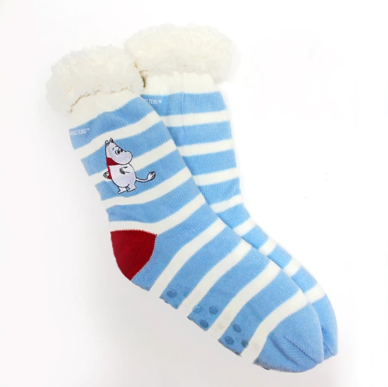 These super comforting slipper socks feature Moomin embroidered on the side and a thick blue stripe pattern. Complete with a fleecy lining for extra comfort and anti-slip dots. Ideal for a cosy night in.Β Officially Licensed Moomin Characters embroidered stripe slipper socks