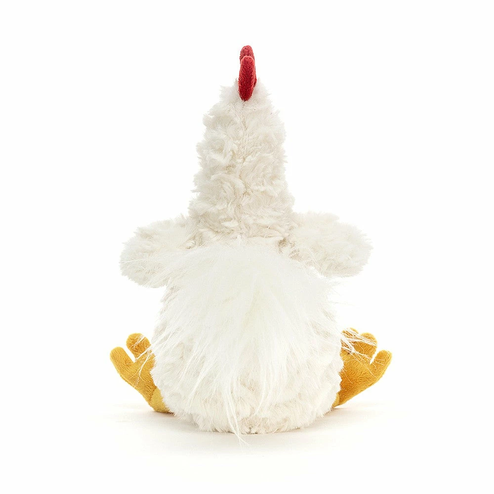 A ruffled, creamy, feathered fluffball with a handsome scarlet comb and beard โ that’s Bessie Chicken. And look at that great floof of tail feathers, those bold yellow feet. Bessie’s a squeezable sweeheart!ย