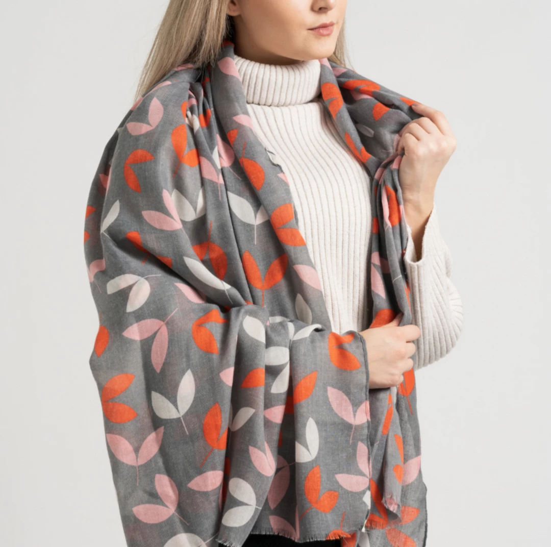 Little Leaves in orange, pink and creamΒ print scarf on aΒ grey background made from a soft and light fabric