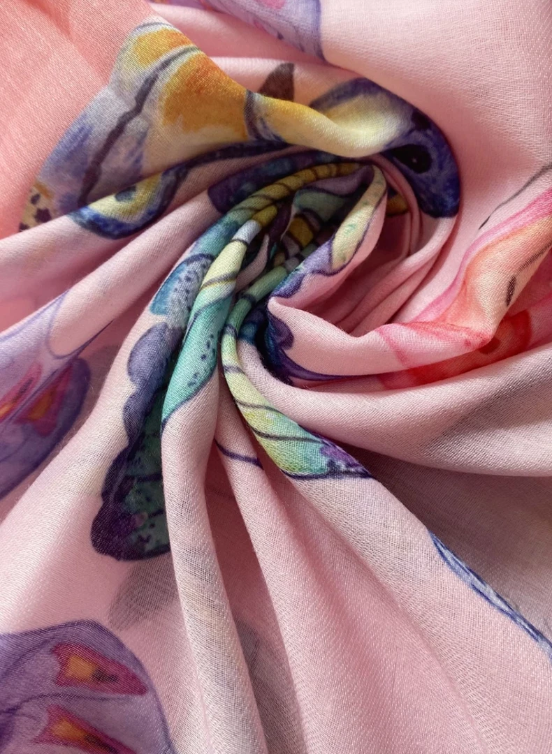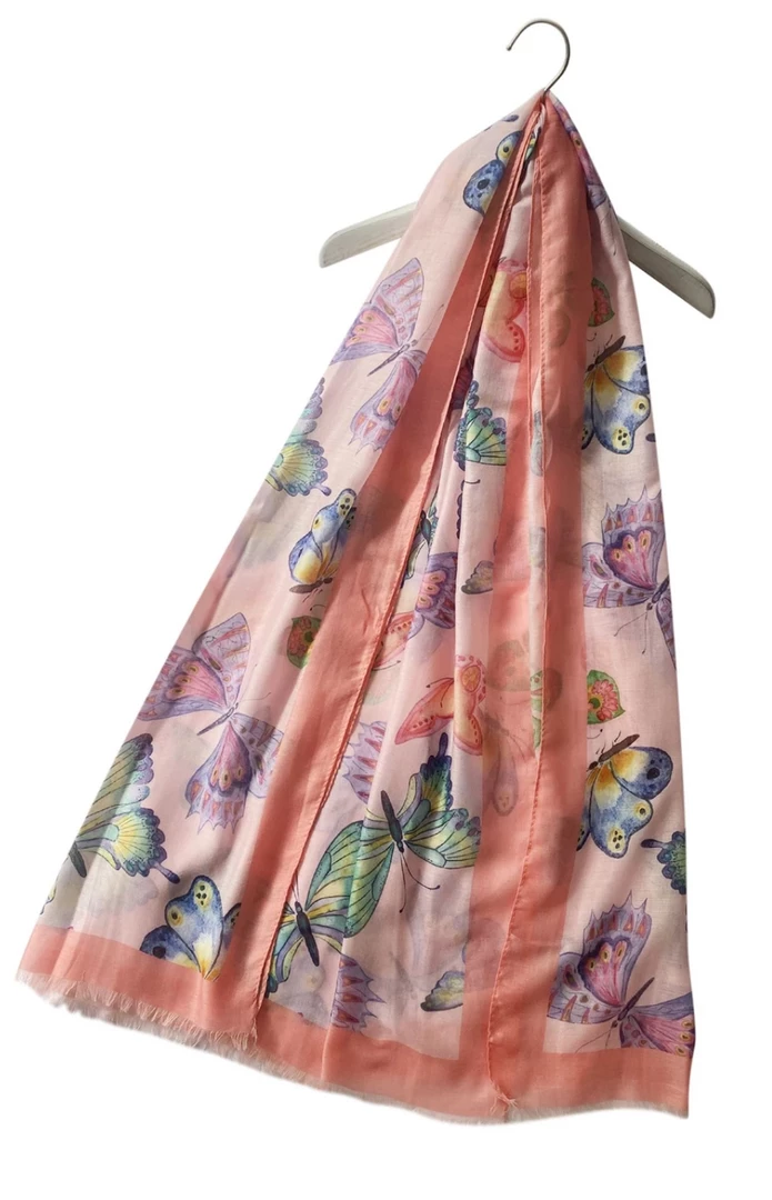 Β A bright and bold soft scarf featuringΒ painted butterfliesΒ with a frayed edge hem. Perfect for brightening up an outfit for the summer!
