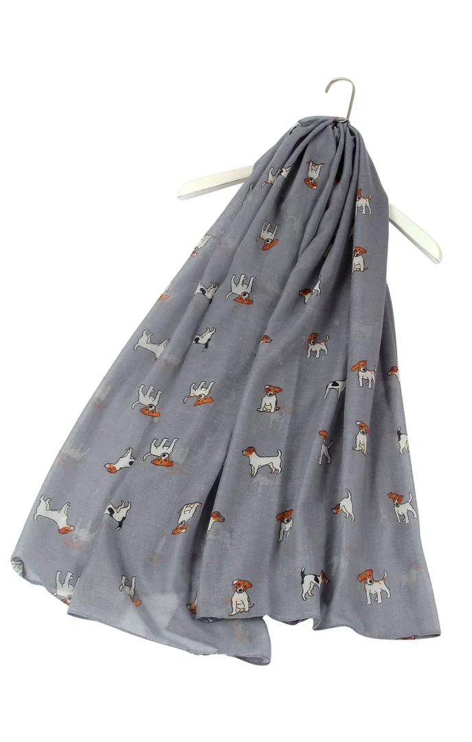This scarfΒ has printed Jack Russell dogs on a navyΒ background and is super soft and lightΒ
