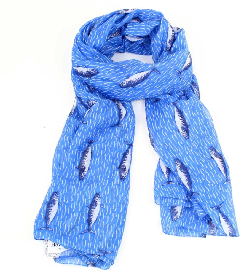 AΒ beautifulΒ sea inspired scarf with mackerel in beautiful blue tones