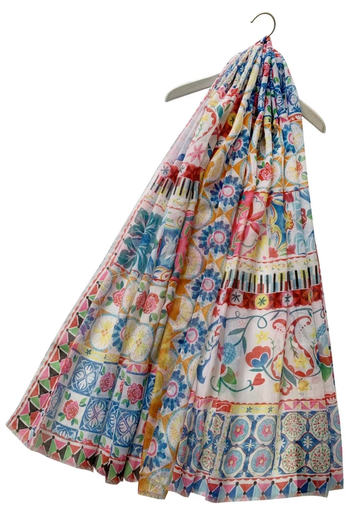 A bright and bold soft scarf featuringΒ a gorgeous summery print with a frayed edge hem. Perfect for brightening up an outfit for the summer!