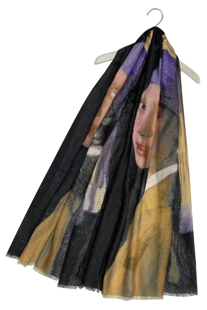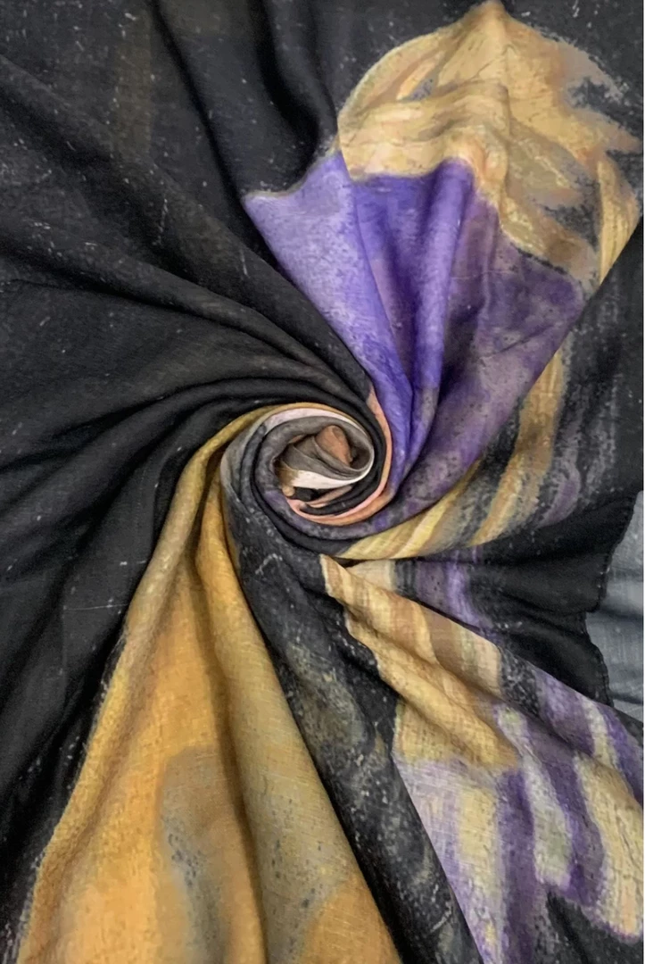 A bright and bold soft scarf featuringΒ a painting byΒ Van Gogh with a frayed edge hem. Perfect for brightening up an outfit for the summer!