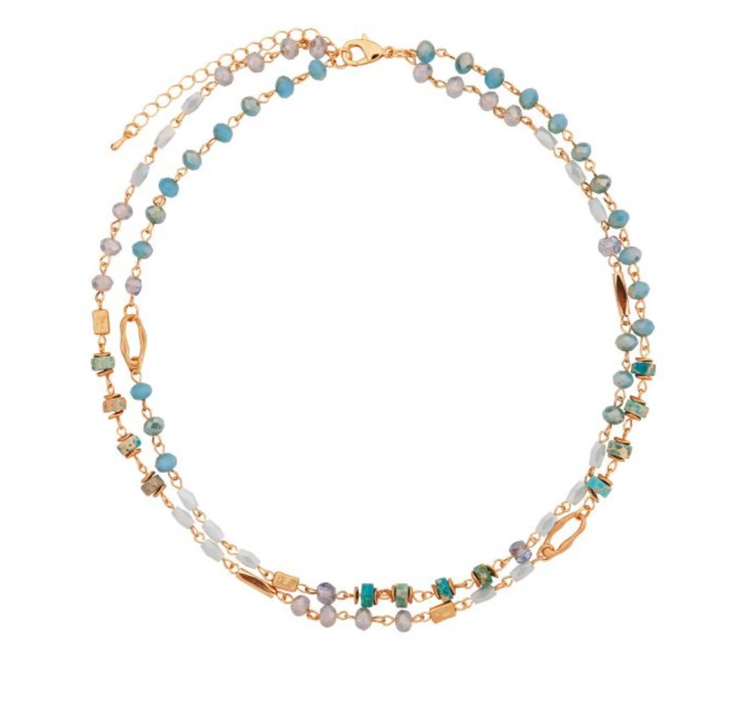 A gorgeousΒ short double row necklace in gold coloured nickel free metal with natural crystals and semi precious stonesΒ in blue and turquoise tones.Β Β