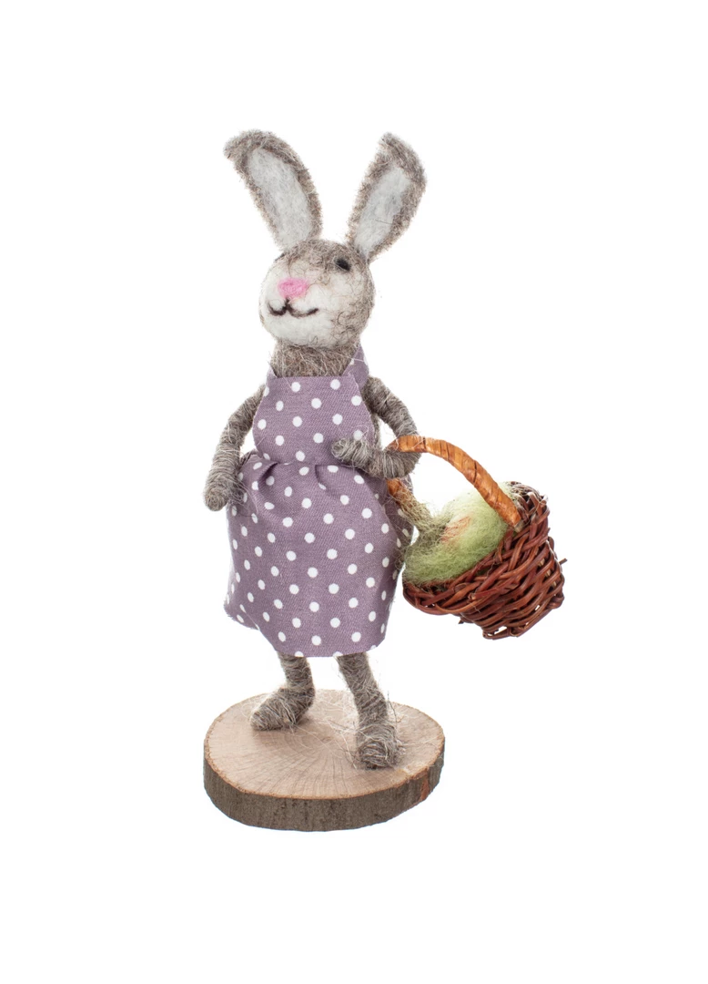 Celeste standing bunny hasΒ a pretty lilac spotty dress and a real wicker basket with a toadstool in it. She isΒ is the perfect Easter gift! She is made using wet felting and needle felting techniques, with hand stitched embroidery forΒ her adorable little expression.Β