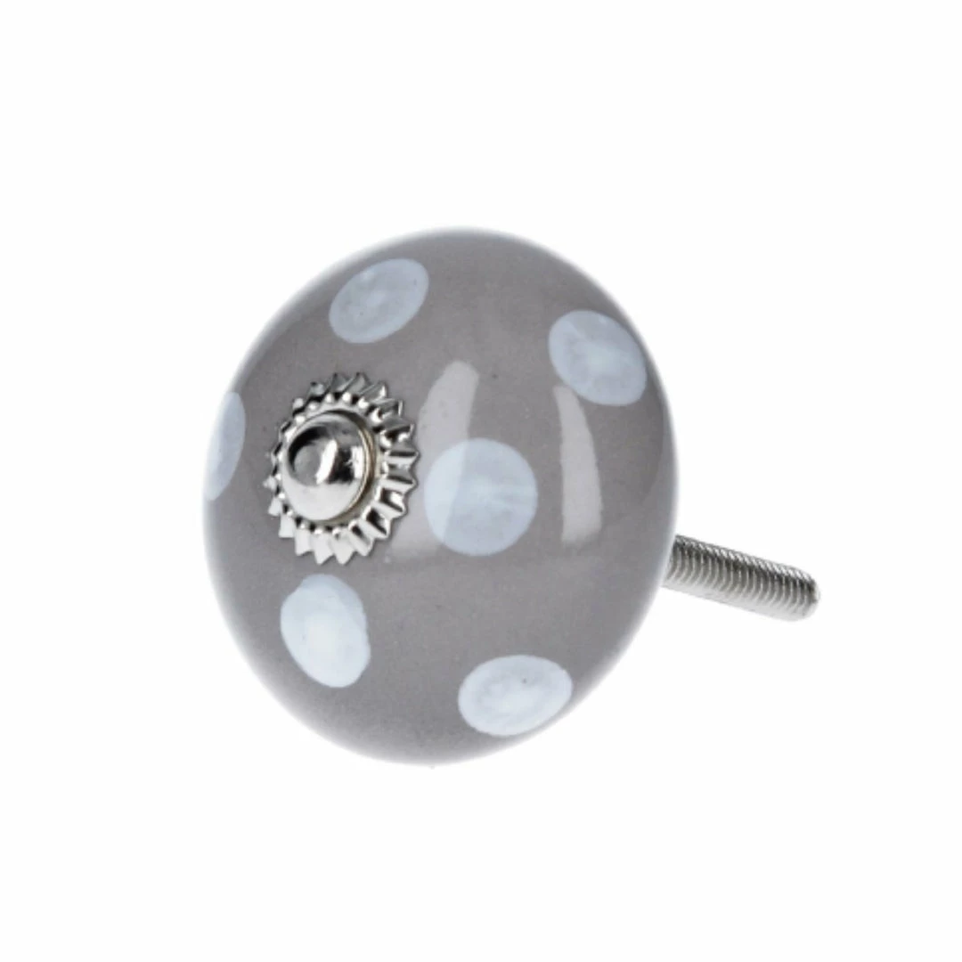 Perfect for updating drawers or wardrobes, this ceramic knob in pale grey withΒ white spotsΒ has aΒ silver coloured metal backplate, 1 washers and 1 nut.Β The screw is 3 cm longΒ and the thread diameter is 4mm andΒ is very easy to fit.Β Standard screw fits doors up to 27mm