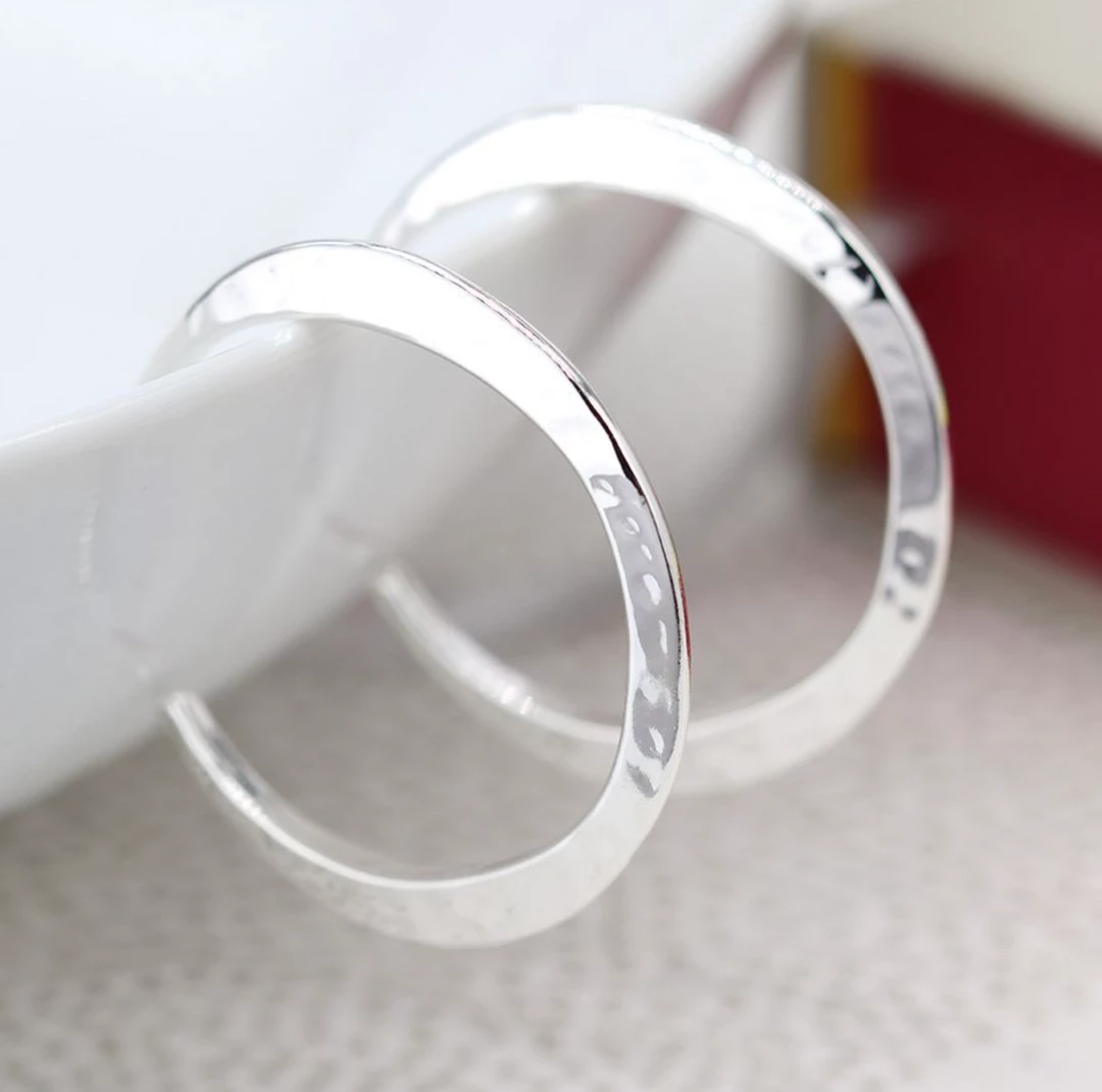 Silver plated open hoop stud earrings with a polished finish and irregular beaten surface