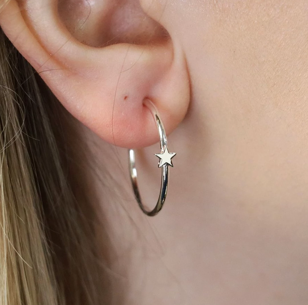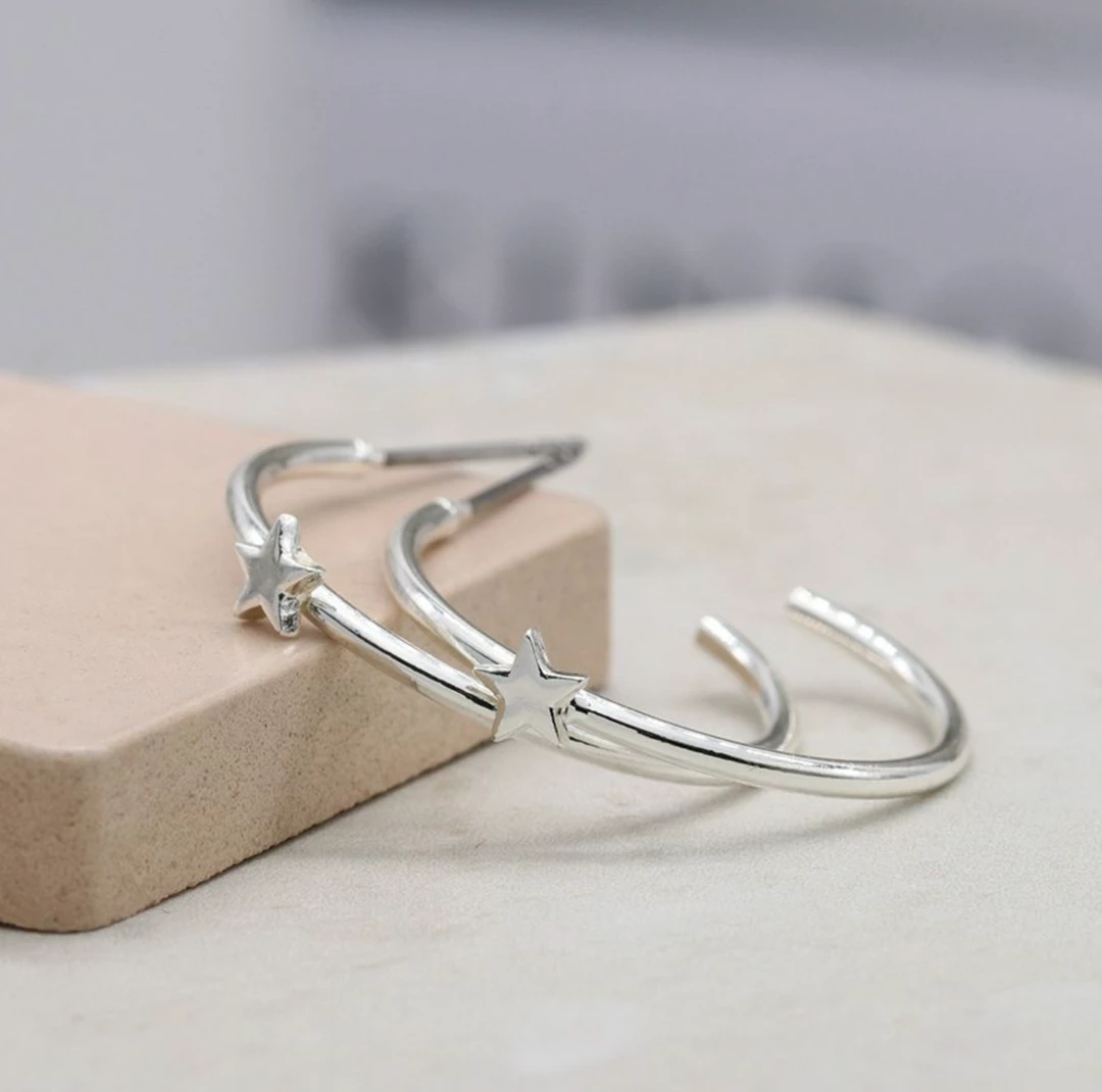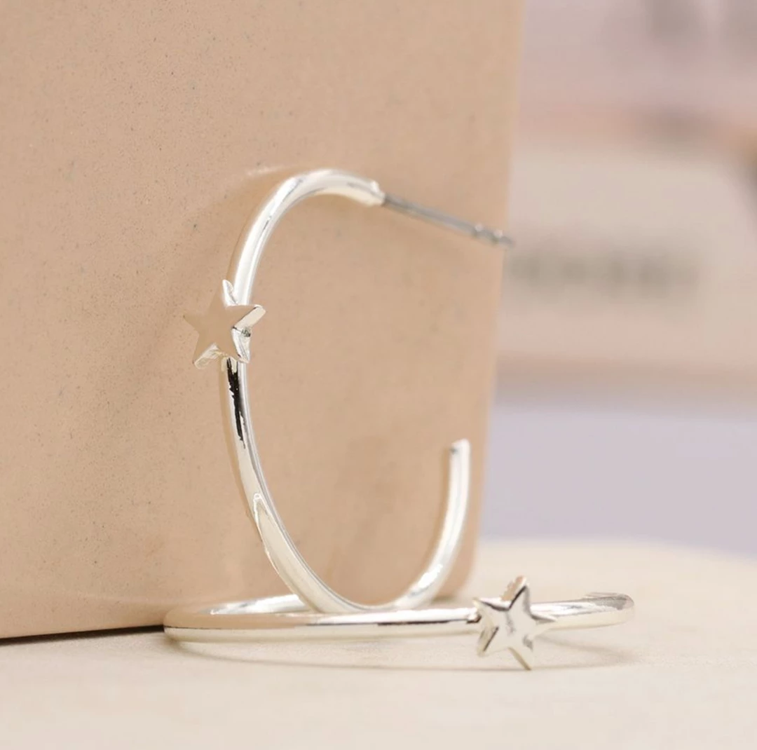 Silver plated fine open hoop stud earrings with a single star fixed to the front of each hoop.