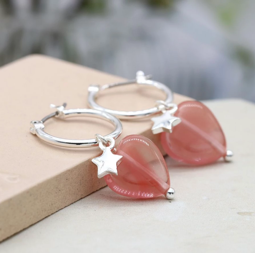 Silver plated hoop earrings with a pink stone heart drop and silver star charm