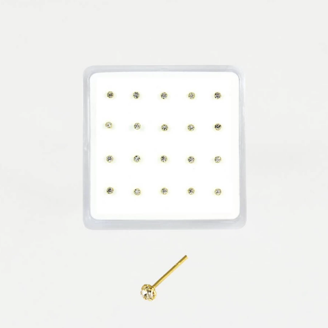 RoundΒ clear gem nose pins in Gold plated Sterling Silver. These nose pins have a straight back.Β