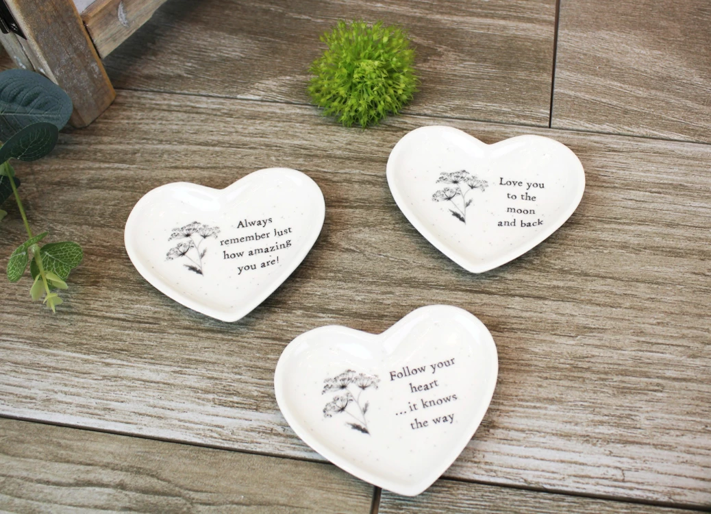 A sweet heart shaped ceramic dish with three designs to choose from. A lovely practical gift for holding jewellery, small items or just to admire!ย