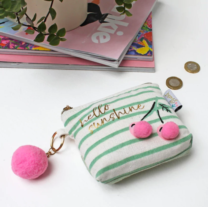 House of Disaster summer vibe cotton mini zip purse featuring pompom detail, summer fruits print and removable pompom key ring. ‘Hello Sunshine’ print in gold foil. Repeat print featuring illustrated pineapple, cherry and avocado. Great as a coin purse/mini wallet.