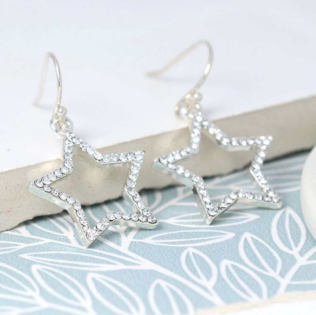 Silver plated open star drop earrings, each inset with little clear faceted crystals.