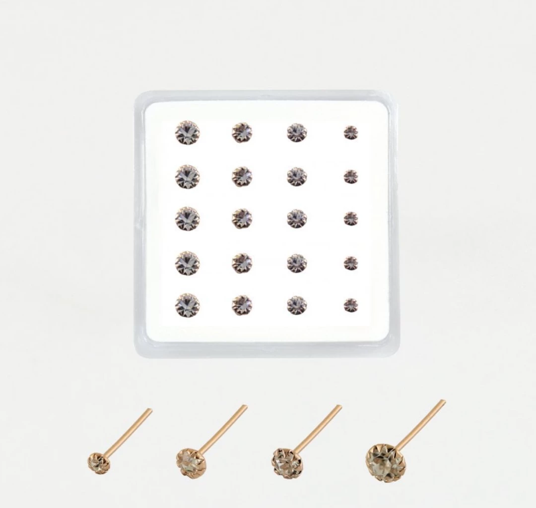 SquareΒ clear gem nose pins in Gold plated Sterling Silver. These nose pins have a straight back and are available in four sizes