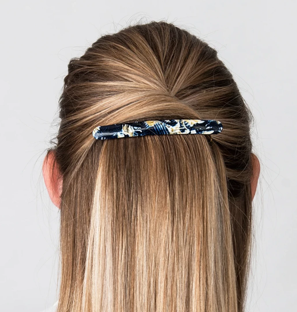 Long resin hair clipΒ on a presentation card