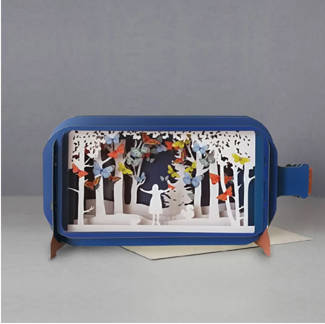 Beautifully engineered with handcrafted perfection. These exquisite cards are crafted with six layers of laser and die cut paper creating a three dimensional diorama.