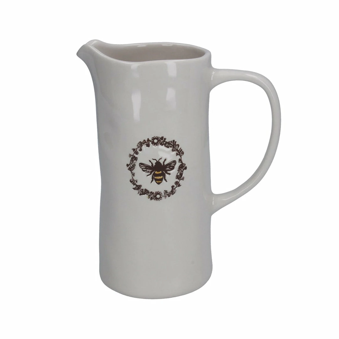 This Gisela Graham large ceramic jug has aΒ slightly rippled surface with an embossed print of aΒ honey bee with a circle of flowers and foliage. Perfect for displaying flowers or using for water or drinks. Roll on the summer!Β