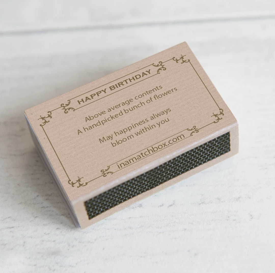 “A little gift with a BIG surprise… Show that special person they are the pick of the bunch with this delightful miniature bouquet of paper roses, beautifully presented in a matchbox. On opening the matchbox the recipient will be presented with an exquisite bunch of handmade pink roses in a tiny glass vase, and the message ‘a bunch of love’. A truly unique keepsake gift, ‘Happy Birthday’ In A Matchbox is the perfect way to tell someone they are blooming amazing. Made from: paper roses, glass bottle, card.”