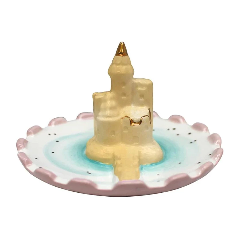Bring a little bit of the seaside into your home with this cute Sandcastle trinket dish. Features A small castle in the centre with a tower for hanging your rings over and plenty of space in the dish for keeping your necklaces or desk essentials handy and safe. Shiny gold detailing adds an extra bit of sparkle to this pretty little dish. Not recommended for dishwasher use. Not microwave safe