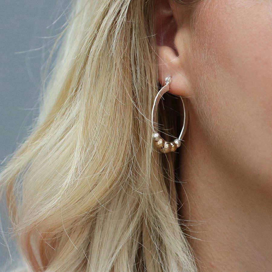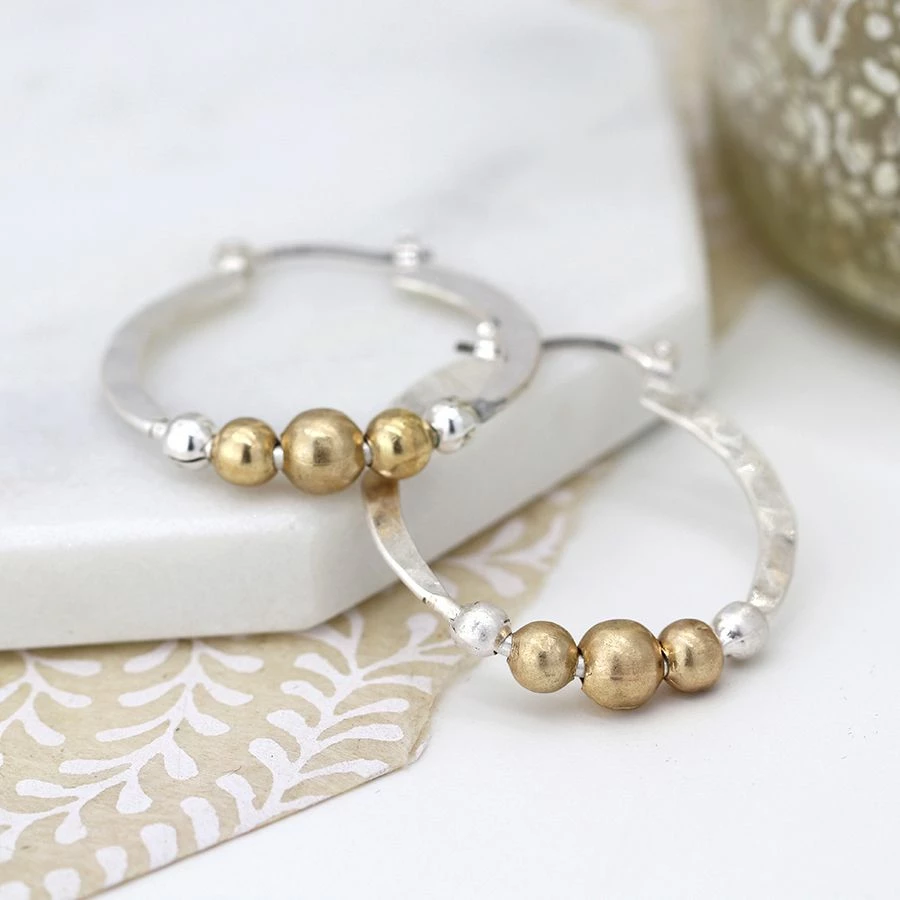 Silver plated hoop earrings with a textured surface, contemporary worn finish and gold plated beads. Matching necklace available.