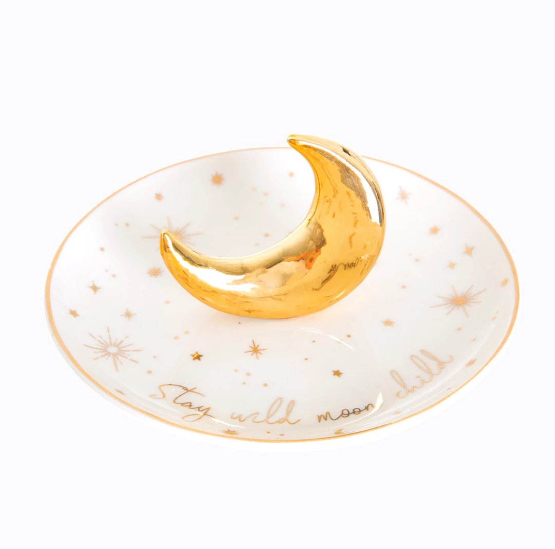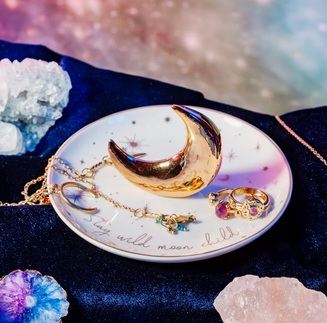 This twinkling trinket dish features a simplistic clean white base to complement the galaxy gold accents of the Celestial design and the quote ‘Stay wild Moon Child’.