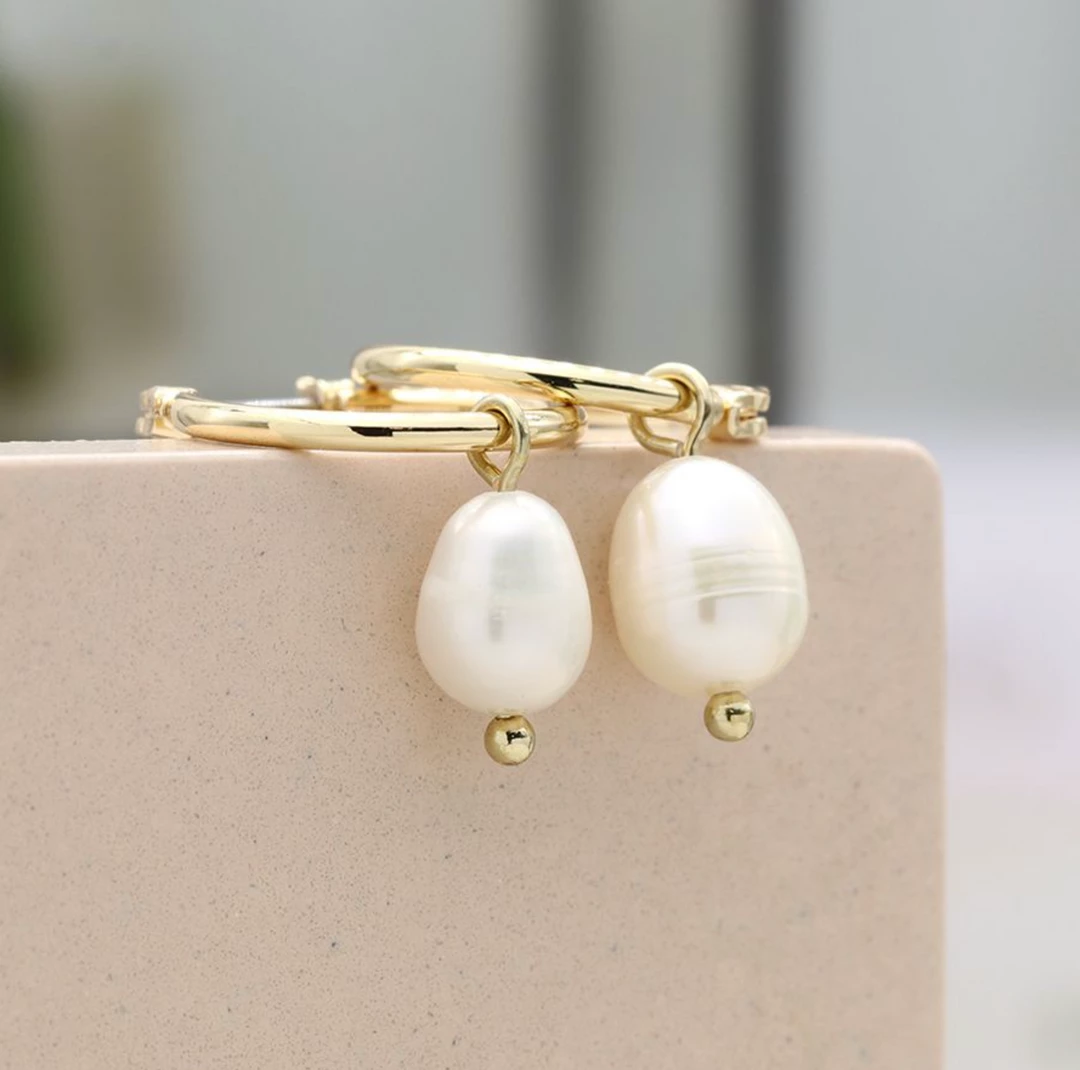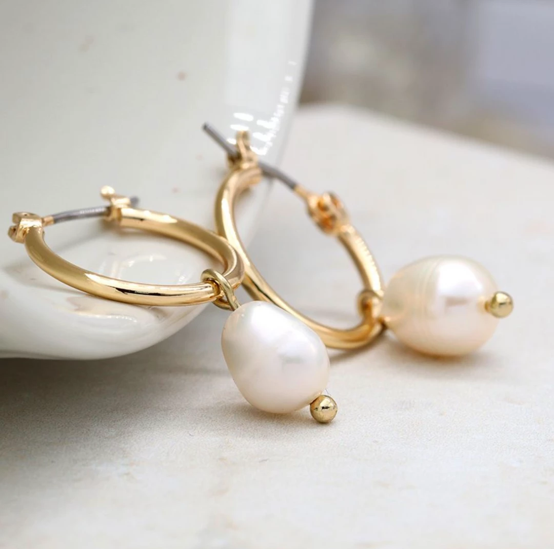 Faux gold plated hoop earrings with a single ivory pearl drop on each