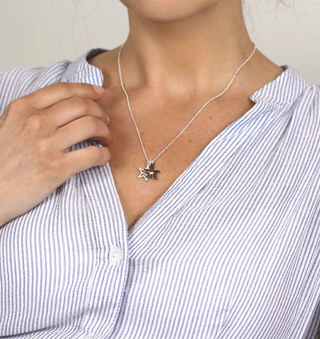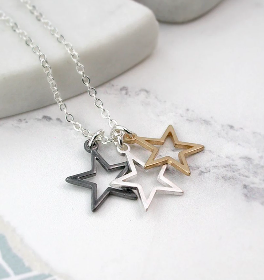 Silver plated fine chain necklace with three open stars in contrasting worn silver, gold and hematite finishes.