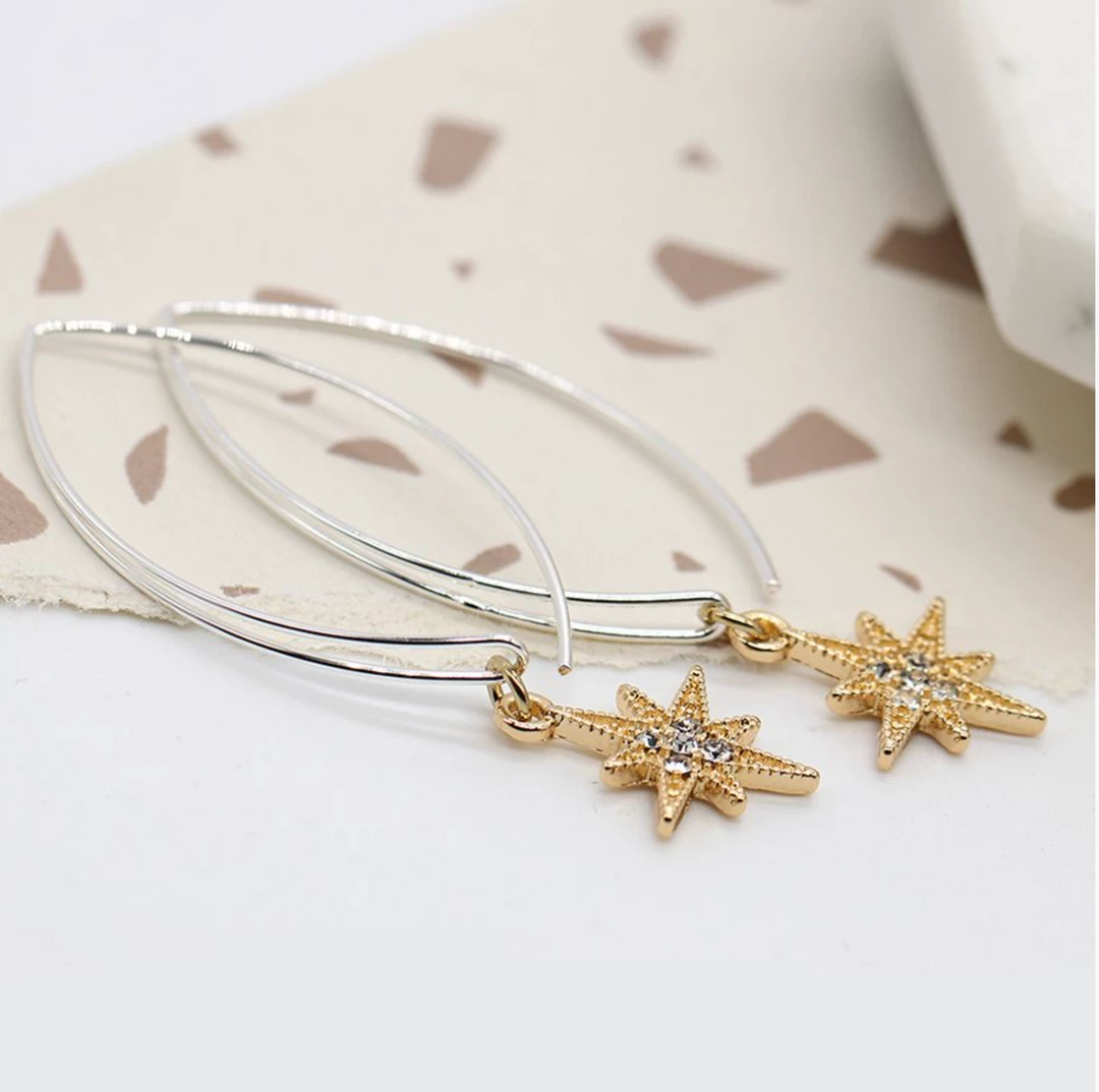 Silver plated ellipse drop earrings with golden star charms featuring decorative edges and crystal centres