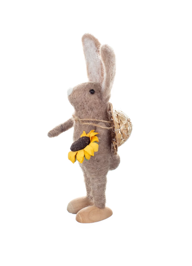 Petal the sunflower bunny has a little crochet bag and is carrying a yellow paper sunflower. She has little wooden feet so stands up easily. She isΒ is the perfect Easter gift! She is made using wet felting and needle felting techniques, with hand stitched embroidery and beady eyes forΒ her adorable little expression.Β