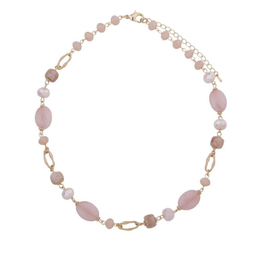 A gorgeousΒ short necklace in gold coloured nickel free metal with natural crystals and semi precious stonesΒ inΒ pink tones.Β Β