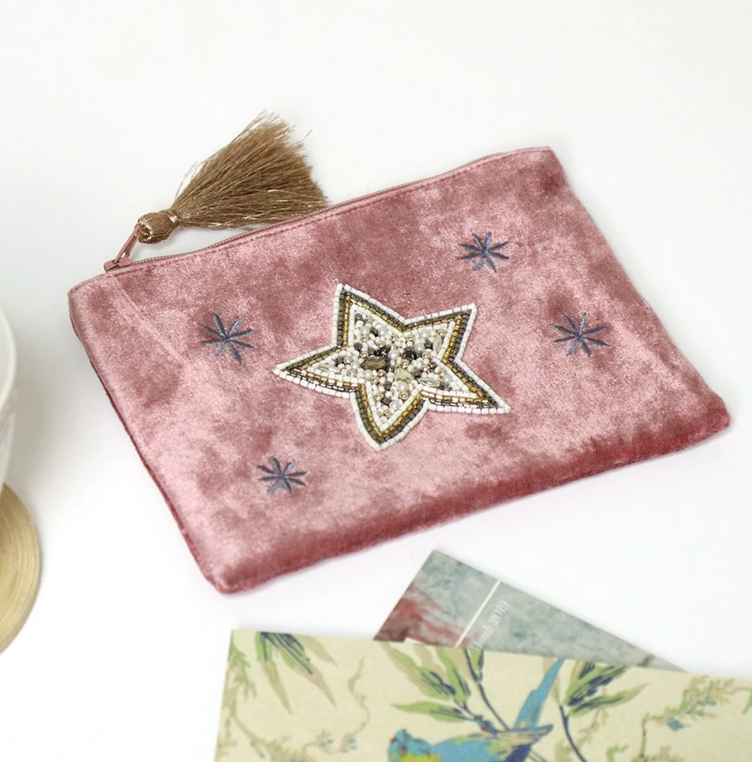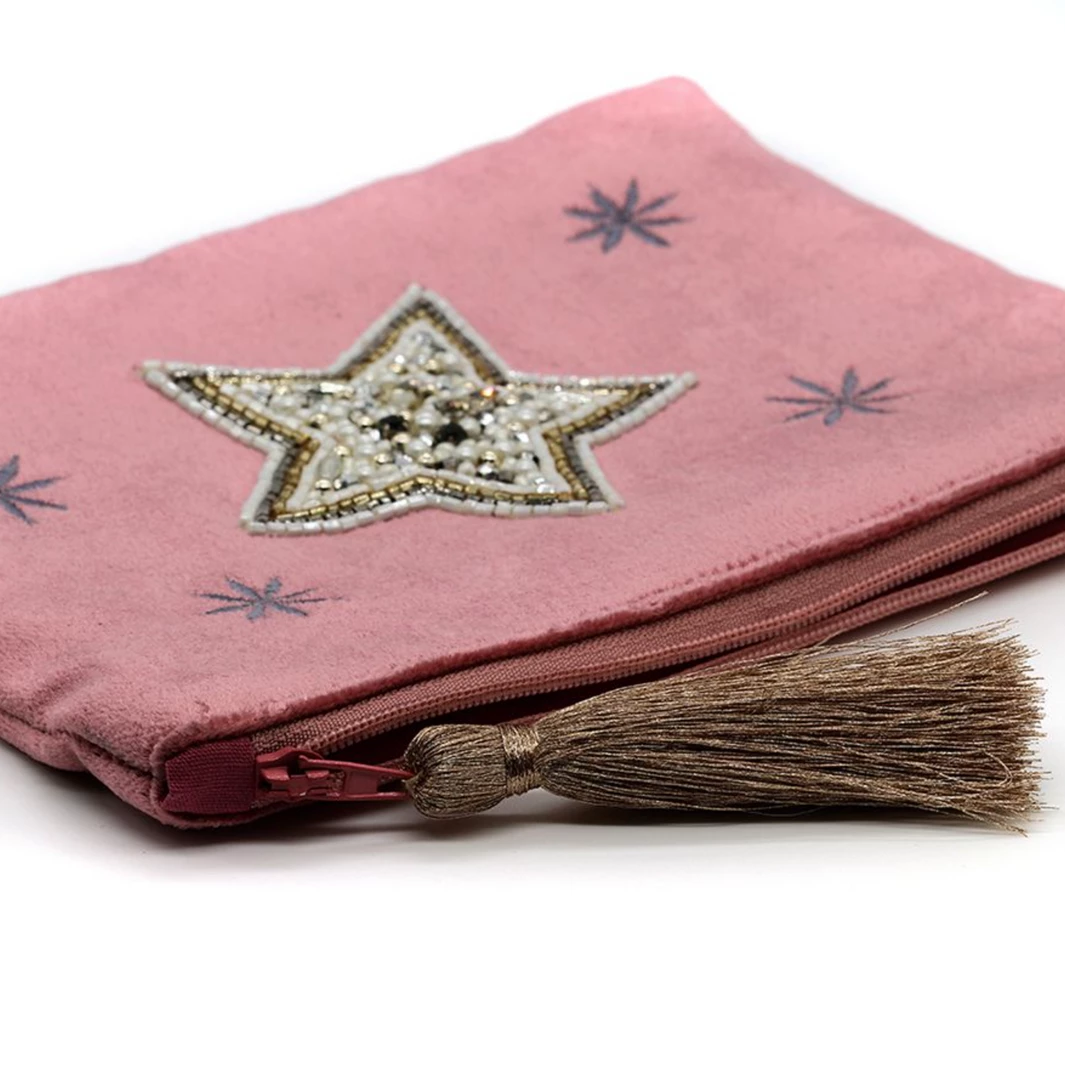 Pink velvet zip purse decorated with stars, four little embroidered stars and one large embellished star in the centre. A metallic rose gold tassel finishes the zip.