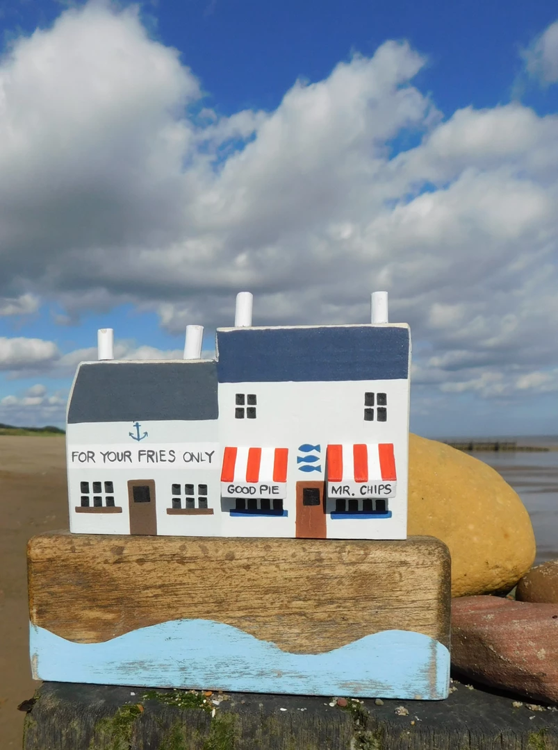 AΒ fun rustic scene with twoΒ seaside shopsΒ with a metal awning over the chip shop.Β